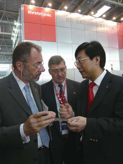 2009年4月9日上午,瑞士驻华大使Mr.Blaise Godet先生以及参赞Mr. Claudio Mazzucchelli在瑞士工业协会秘书长Christoph Blaettler的陪同下,参观了展览会,并亲临百超展位,百超中国区董事总经理王鹤龄先生详细介绍了百超的参展展机:最受欢迎的激光切割机ByJin选配智能化自动上下料系统ByTrans和广受追捧的折弯机Xcel,以及本次展会的成交情况。