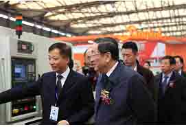 图为中共中央政治局委员、上海市委书记俞正声等领导兴致勃勃地来到上机公司展台参观了出展机床,并听取了公司总经理石光对出展机床技术、性能及用途的介绍。