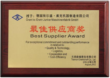 全球最大的曲轴生产商之一——来自中国山东省的天润曲轴有限公司授予勇克集团“最佳供应商奖”,以表彰勇克集团在质量和工艺,物流管理,团队协作和成本效益等各方面的卓越表现。