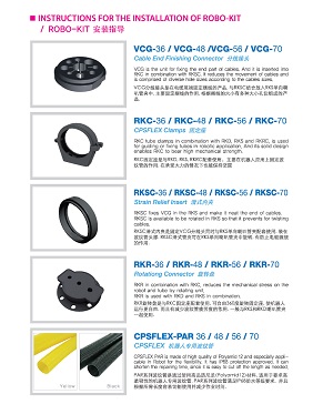 韩国CPS首次开发的Robo-kit是保护机器人电缆,引导电缆传动,为减少相互摩擦,延长电缆的使用寿命,提高机器人的活动范围的专用系统。 Robo-kit管线包系统: 机器人专用波纹管(PAR36/48/56/70) 管夹(RKSRKD) 防撞块(RKTP) 固定座(RKC) 旋转盘(RKR) 分线接头(VCG) 波纹管引导装置(RDD) 管线包安装支架 上海儒隆自动化科技有限公司代理韩国Robo-kit管线包系统,三维拖链、旋转拖链、机器人电缆等产品。