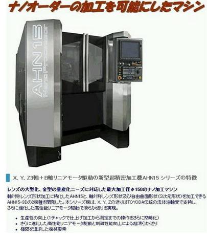 全球超精密加工领域中精度最高的母机,来自日本捷太科特Jtket的AHN15-3D自由曲面金刚石加工机,此设备主要用来对各种光学镜头和蓝光镜片模具进行超精密车削及研磨。这台机子的性能达到了30nm部件形成精度和1nm级ra表面粗糙度,仅从加工精度上讲比三台军工神器(美国LLNL的LODTM和DTM-3,英国CUPE的OAGM2500)还要高出近8倍。这台母机在超精加无敌地位是无需置疑的。