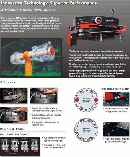 通过独创的双伺服电机驱动结构开发出的拥有世界最快速加工力的数控转塔式冲床——天田em-nt series(70工作塔位 4自动旋转塔位 500次冲孔/分 1800次步冲/分
