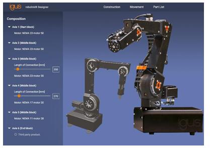 借助全新的“robolink设计器”,客户可以在直观的CAD界面上逐步选择所需部件,从而快速、轻松地完成从第一轴到整机的配置。Martin Raak表示:“机械臂的长度可以根据机器人的工作区域进行调节。而且,在平板电脑上也可以使用设计器进行视觉模拟旋转关节的运动。” 在配置完成后,设计器会直接向igus发出零件清单和请求。