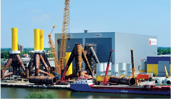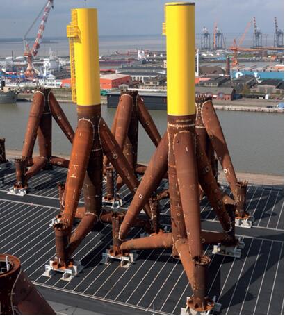 较深水域的大型风力发电机需要构建在诸如三角架结构的多个基点上,三角架由大型钢管构成三个稳定的支撑基础。用在海上风力发电机上的三角架有的高达60米,重达960 吨,其结构质量和尺寸精度是制造海上风力发电机最重要的环节,也是难点环节。