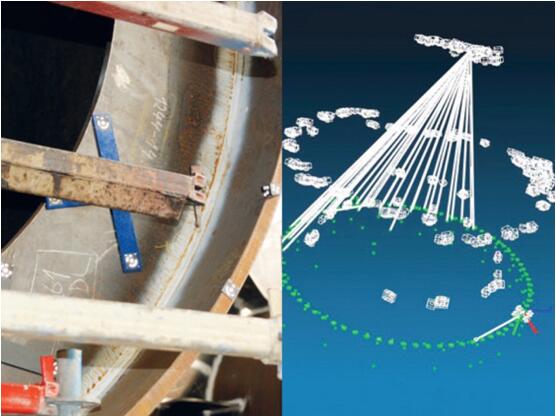然后系统会在计算机中处理数字图像,并自动计算标记点的3D坐标。从标记、图像采集到自动报告生成,不到1小时就可以完成法兰测量。DPA 测量系统极为灵活,也可用于其他测量任务,例如圆度测量、CAD 对比、形变分析和焊接变形等方面。