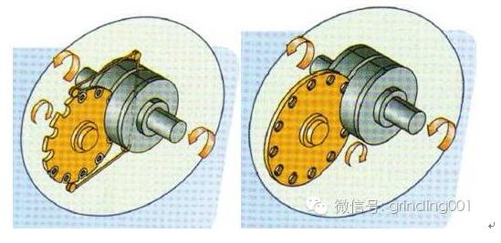 这里所讲的砂轮开槽,不是指对砂轮整个磨削面进行开槽,前面讲到了要使砂轮有好的排屑效果,把砂轮型面做成蜂窝孔形式。在卧式双端面磨削中,这还不够,一般都要 对砂轮中孔周围切割开槽,原因有两点: