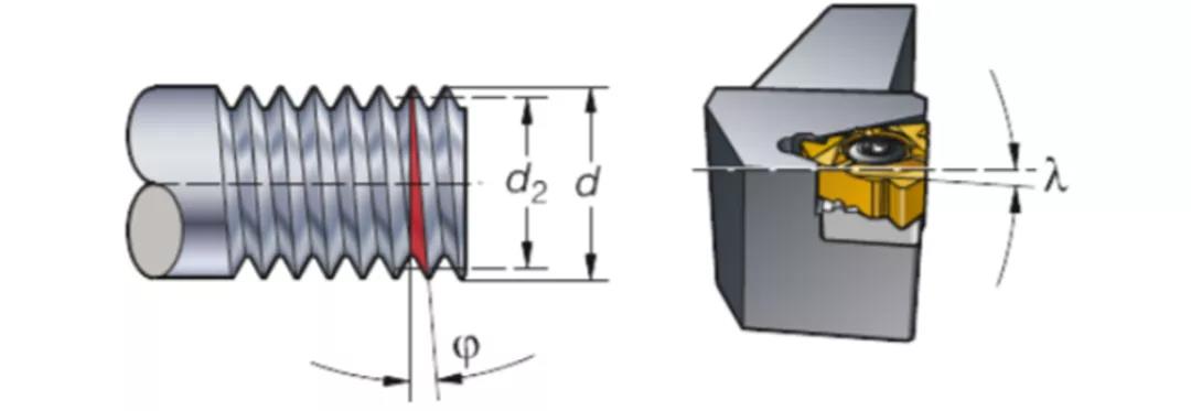 根据刃倾角选择刀垫。工件直径和螺距会影响刃倾角。从下图可以看出,工件直径为40mm,螺距为6mm,所需的刀垫必须具有3°刃倾角(不能使用标准刀垫)。
