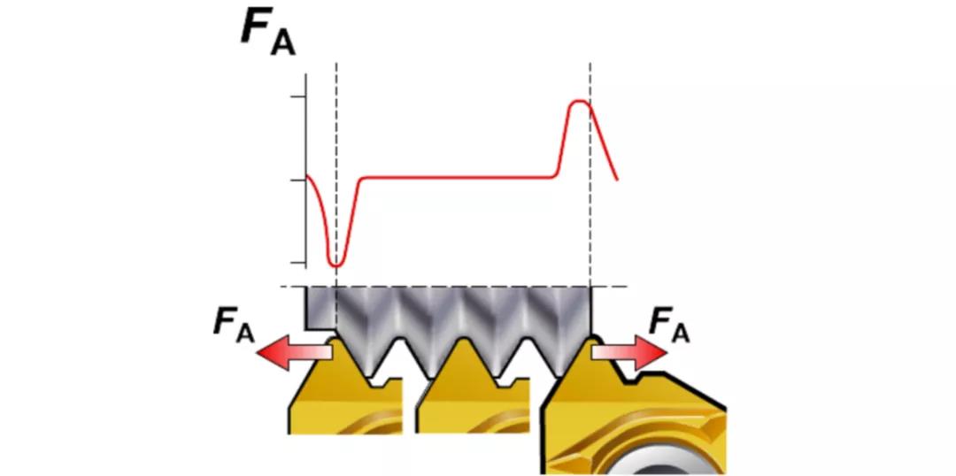 - 螺纹加工工序中的最高轴向切削力在切削刀具切入和切出工件期间出现。