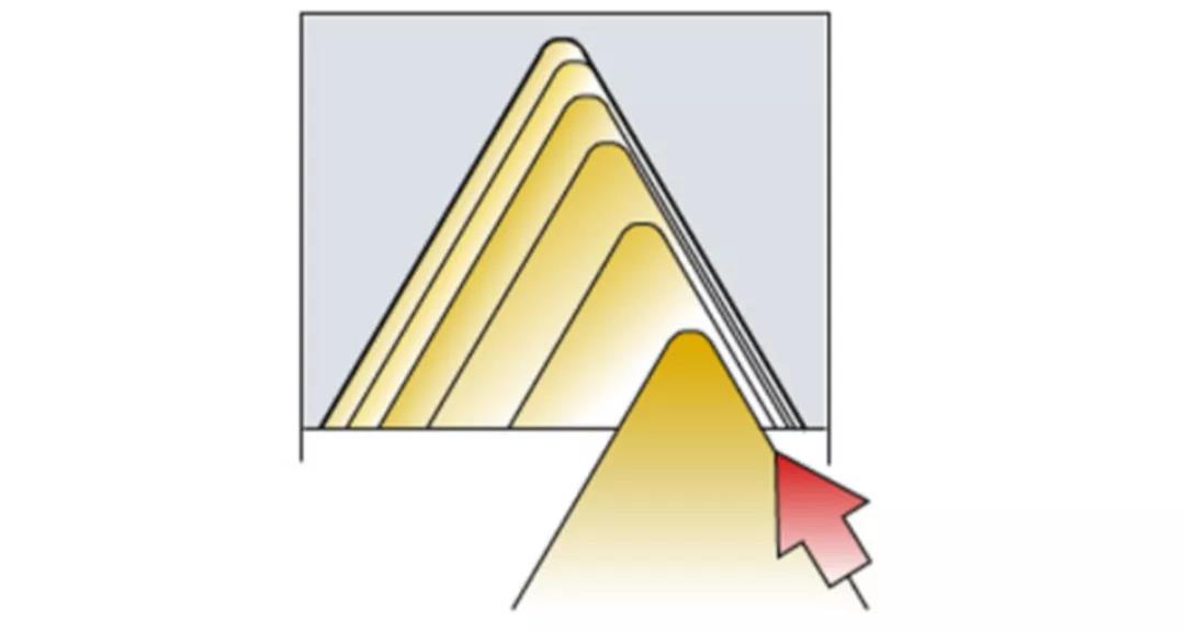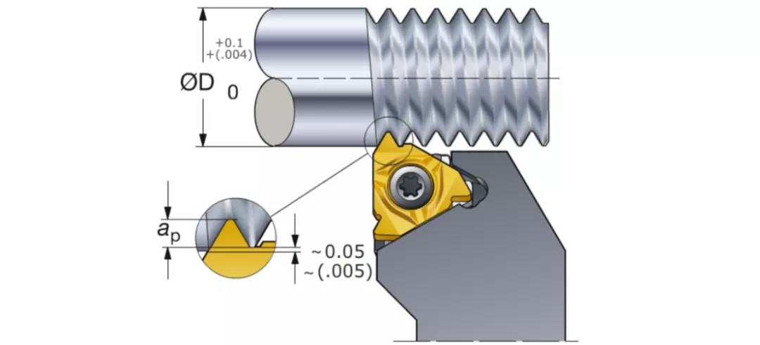 利用额外余量精修螺纹牙顶:加工螺纹之前,不必将胚料车削至精确的直径,利用额外余量/材料精修螺纹牙顶。对于精修牙顶刀片,前面的车削工序应留出0.03-0.07mm的材料,以使牙顶正确成形。