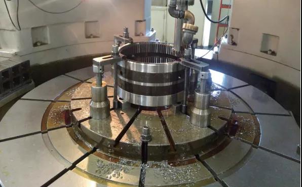 内齿圈材料为常见的35CrMo渗氮钢。由于零件结构属薄壁类,故对生产技术要求较高。零件畸变是个系统工程,前期的毛坯制造、预备热处理、加工制造、生产转运及热处理过程衔接直接影响最后的结果。加工过程采用统一基准,以减小加工应力。齿圈氮化处理通过合理的装炉方式、气压和温升,来保证渗氮变形。通过对多工序的严格控制,试制零件最终达到工件直径变形≤0.02mm、径向圆跳动≤0.02mm及齿部精度7级,完全满足图样和使用要求。
