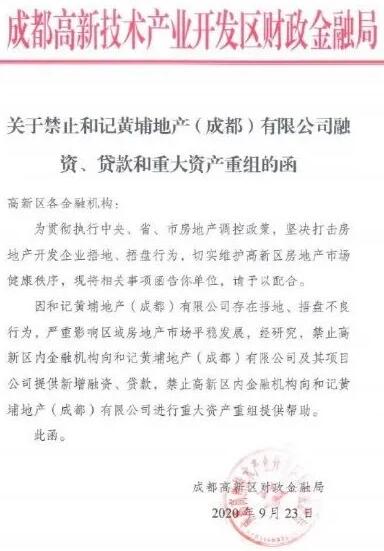 该通知称,为贯彻执行中央、省、市房地产调控政策,监管打击房地产开发企业捂地、捂盘行为,切实维护高新区房地产市场健康秩序,因和记黄埔地产(成都)有限公司存在捂地、捂盘不良行为,严重影响区域房地产市场平稳发展,经研究,禁止高新区内金融机构向和记黄埔地产(成都)有限公司及其项目公司提供新增融资、贷款,禁止高新区内金融机构向和记黄埔地产(成都)有限公司进行重大资产重组提供帮助。