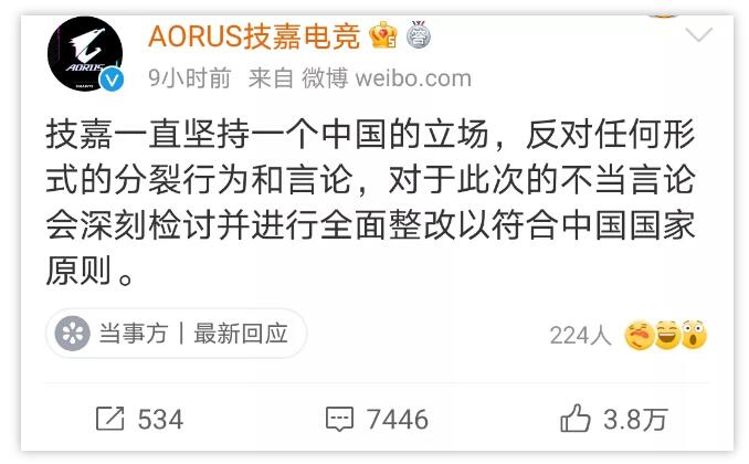 随后,技嘉再次通过微博表态,称“技嘉一直坚持一个中国的立场反对任何形式的分裂行为和言论,对于此次的不当言论会深刻检讨并进行全面整改以符合中国国家原则。”