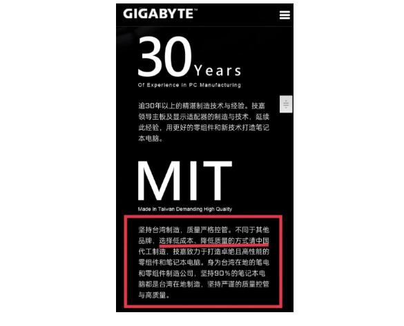 此前,以电脑硬件生产业务为主的中国台湾企业技嘉科技(GIGABYTE),因为在官网描述称:“技嘉不同于其他品牌,选择低成本、降低质量的方式请中国代工制造”等嘲讽中国制造的言论,引发网友众怒。