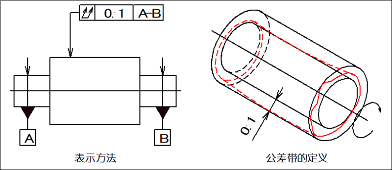 示例1:公差带是距离为半径差0.1mm,且与基准同轴的两圆柱面之间的区域。