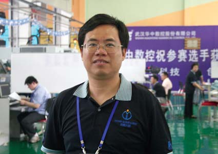 在比赛期间,本刊记者采访了本次高职组数控技能大赛的总裁判——武汉华中数控董事长陈吉红先生。陈总谈到,本次职业数控大赛的宗旨是,检验选手在机床操作过程中的综合能力、创新能力、协调管理能力和团队精神,通过模仿企业真实的生产状态,培养选手的综合素质。