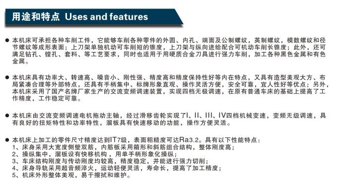 本机床可承担各种车削工件,它能够车削各种零件的外圆、内孔、端面及公制螺纹,英制螺纹,模数螺纹和径节螺纹等成形表面;上刀架单独机动可车削短的锥度,上刀架与纵向进给配合可机动车削长锥度;此外,还可满足钻孔、镗孔、套料、等工艺要求,同时也适用于用硬质合金刀具进行强力车削,加工各种黑色金属和有色金属。