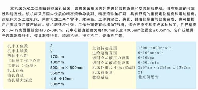本机床为双工位单轴数控深孔钻床。该机床采用国内外先进的数控系统和交流伺服电机,具有很高的可靠性和稳定性。该机床采用国内优质的精密滚动导轨副、精密滚珠丝杆副。具有很高的重复定位精度和运动精度。