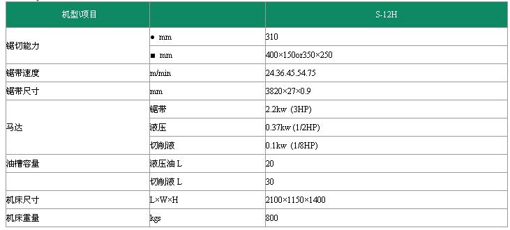 可选配件: 1、浮料送料 2、送料组 3、上压装置 4、电动料架1米,1.5米 5、无动力料架1米,1.5米, 6、夹钳减压 7、自动清屑槽(S12H选配) 8、锯带速度变频控制