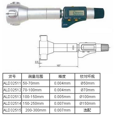 特点:三点定位 1.适用于盲孔和通孔的测量,配有接长杆可测量深孔尺寸。 2.独特的专利结构,测量范围大。 3.硬质合金测量面,棘轮测力。 4.配有校对环规校对零位。 5.IP54 防护等级.符合标准: DIN40050/IEC529 4.接口电缆:P1102(选配) 5.数显系统132-XX-534电子千分尺相同.