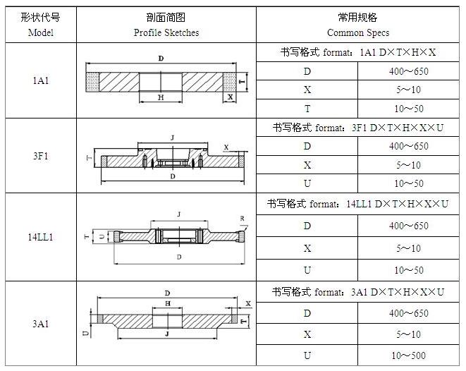 铸铁类:冷激铸铁、球磨铸铁、灰口铸铁、合金铸铁等 钢件类:20Cr、GCr15、 CF53、45钢、55钢、80B高碳钢 1.最高使用速度可达160m/s 2.高标准的出厂精度控制 3.主要磨削性能已达到进口同类产品水平 4.可自制各类砂轮基体